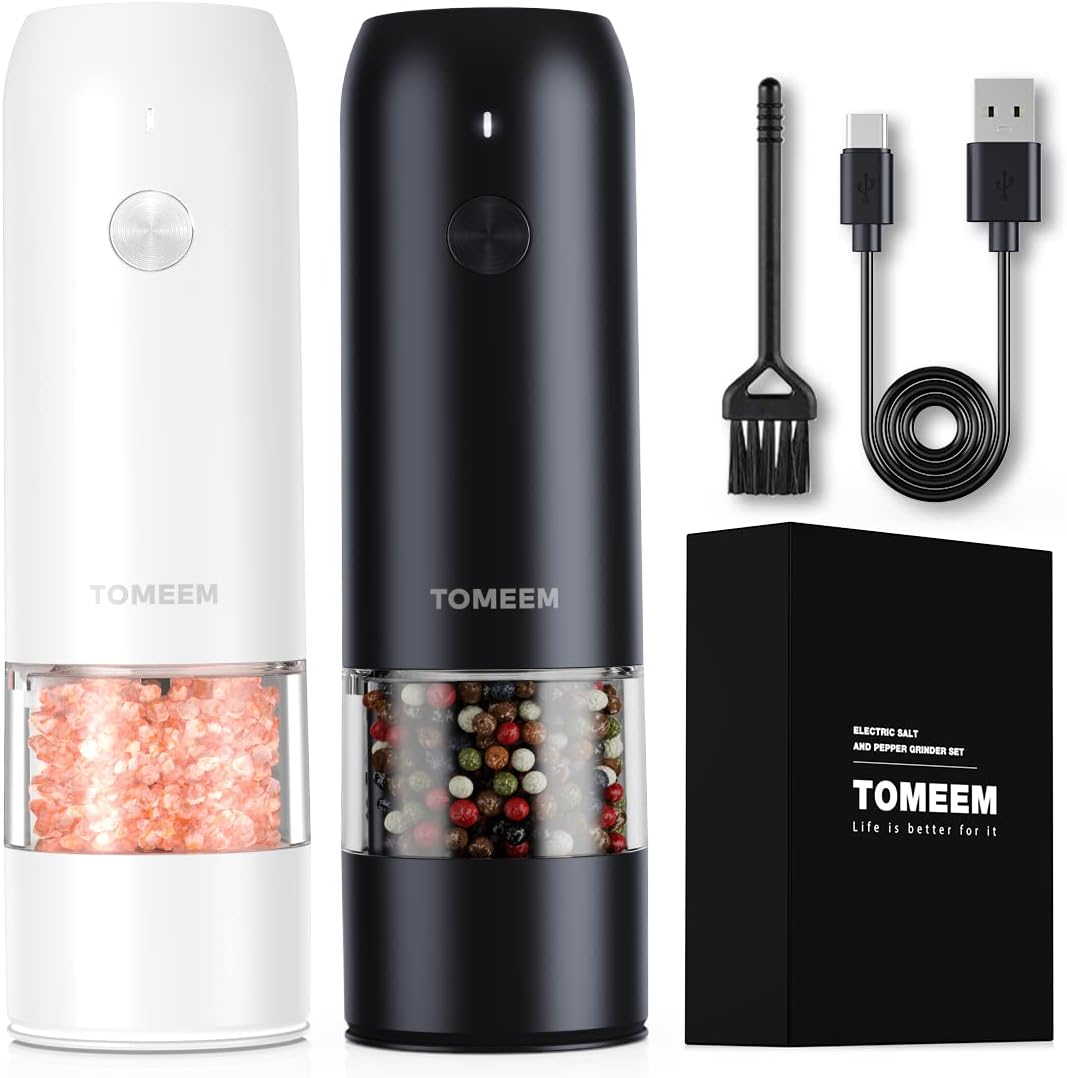 - [Cool Kitchen Gadget Gift] Grinding spices including black pepper, white pepper, salt, Himalayan salt, red pepper flakes, rosemary, anise seeds, flax seeds, and cumin seeds effortlessly, TOMEEM electric pepper grinders for spices and seeds are also perfect gifts for your chef and cook friends.