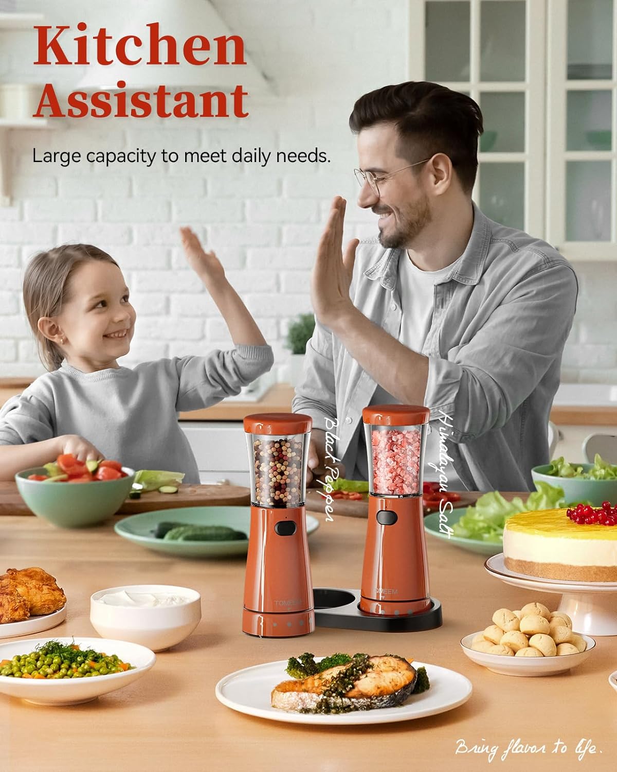Electric Salt and Pepper Grinder Set with Storage Base, Stainless Steel Rechargeable Salt and Pepper Grinder Set with 4.5oz Large Capacity, 1.8" Wide Mouth, Adjustable Coarseness, Bright Orange