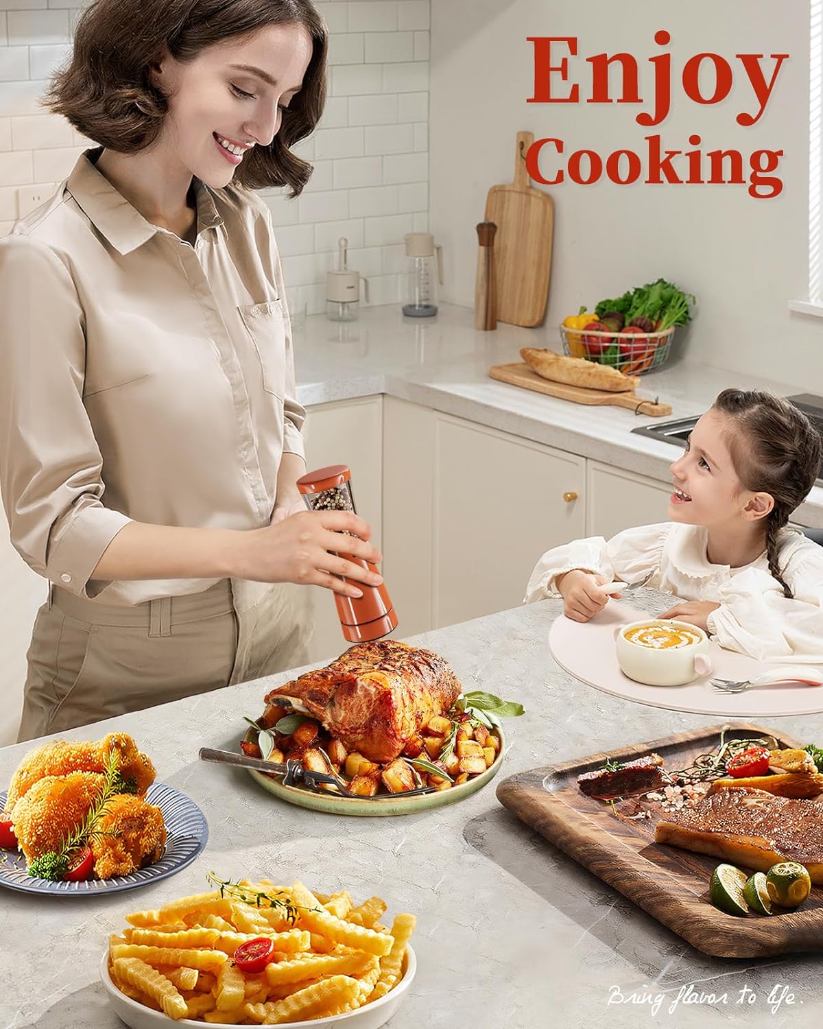 - Bonus Storage Base: This electric salt and pepper grinder set comes accompanied by a practical storage base that not only catches excess spice to keep your table clean but also serves as a stylish display stand, accentuating the elegance of the salt and pepper mill sets when not in use, and making it a functional yet decorative addition to your kitchen arsenal.