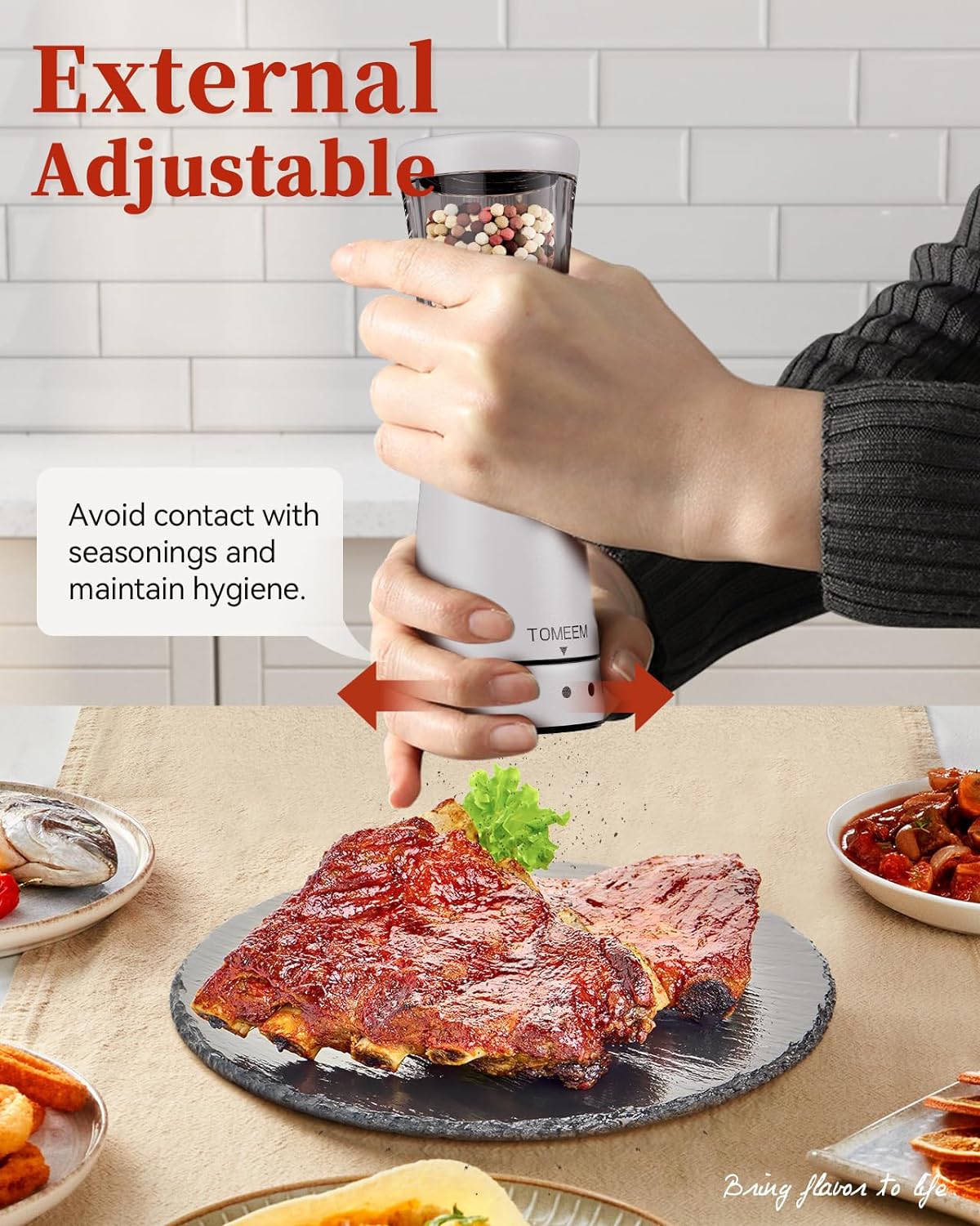 - Precision Grinding with Ease: Achieve the perfect grind every time with the user-friendly adjustable coarseness feature. Simply twist the knob at the base to tailor your spices from fine to coarse.