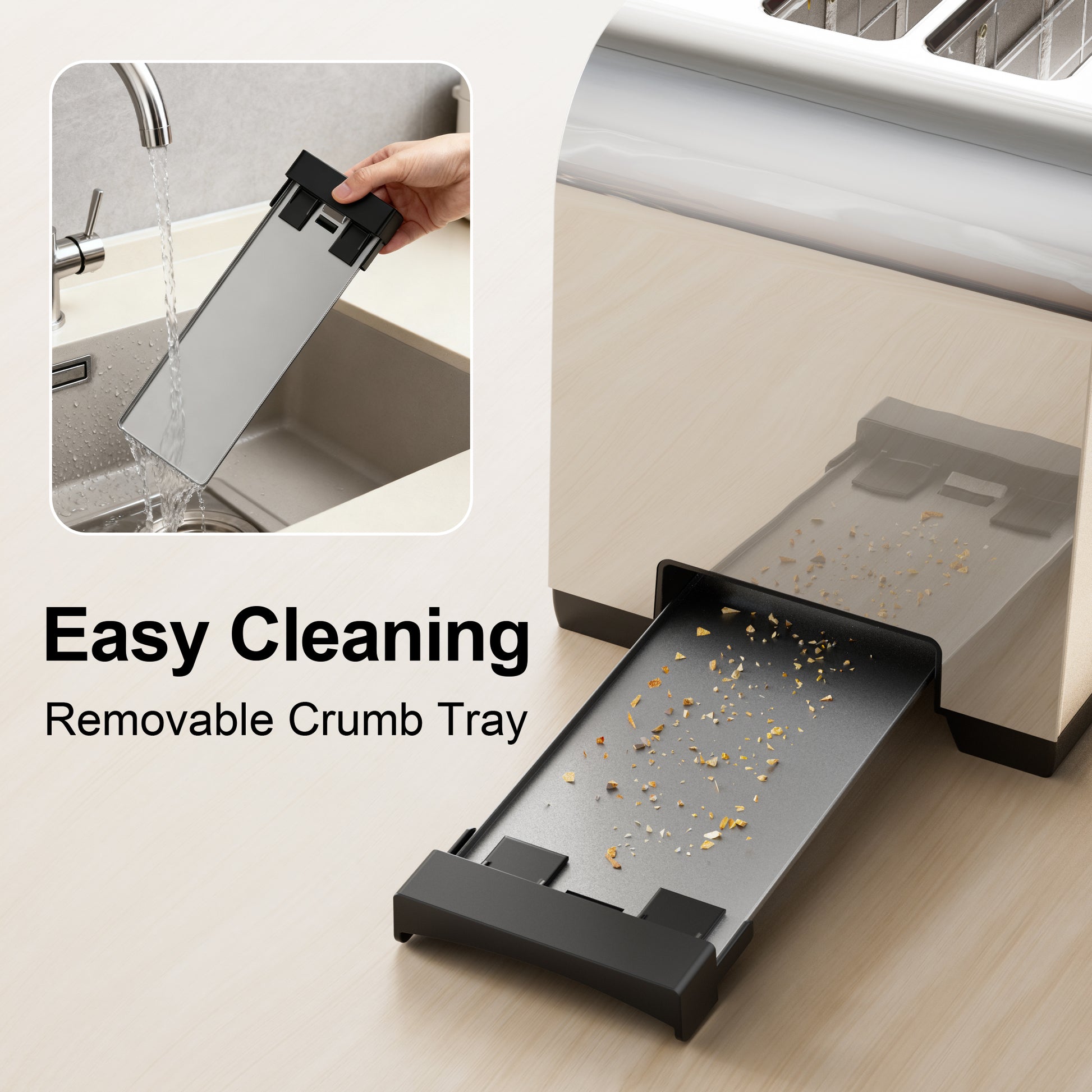- Effortless Cleaning: Designed with non-stick, food-grade stainless steel toasting slots and a removable crumb tray for convenient and hassle-free cleaning.