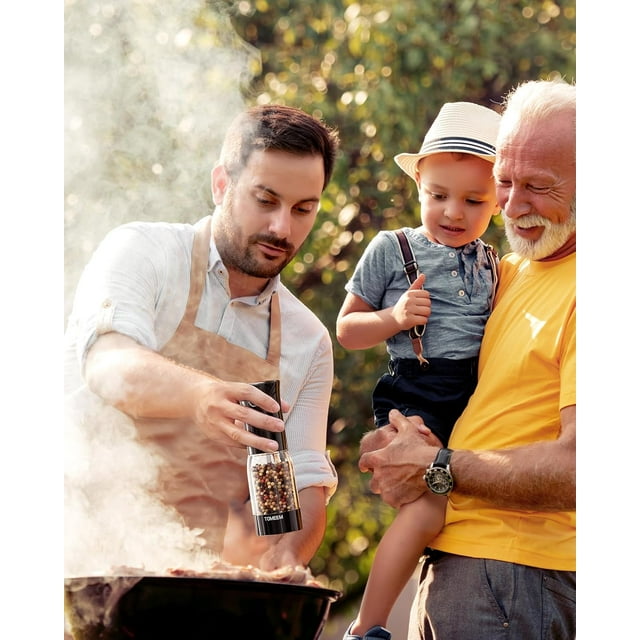 - One handed operation: The narrow upper and wide lower design of the salt and pepper grinder enables better control, allowing for one handed operation, saving time, improving efficiency, and conserving energy and space. Whether indoors or outdoors, simply press lightly to enhance your cooking experience.