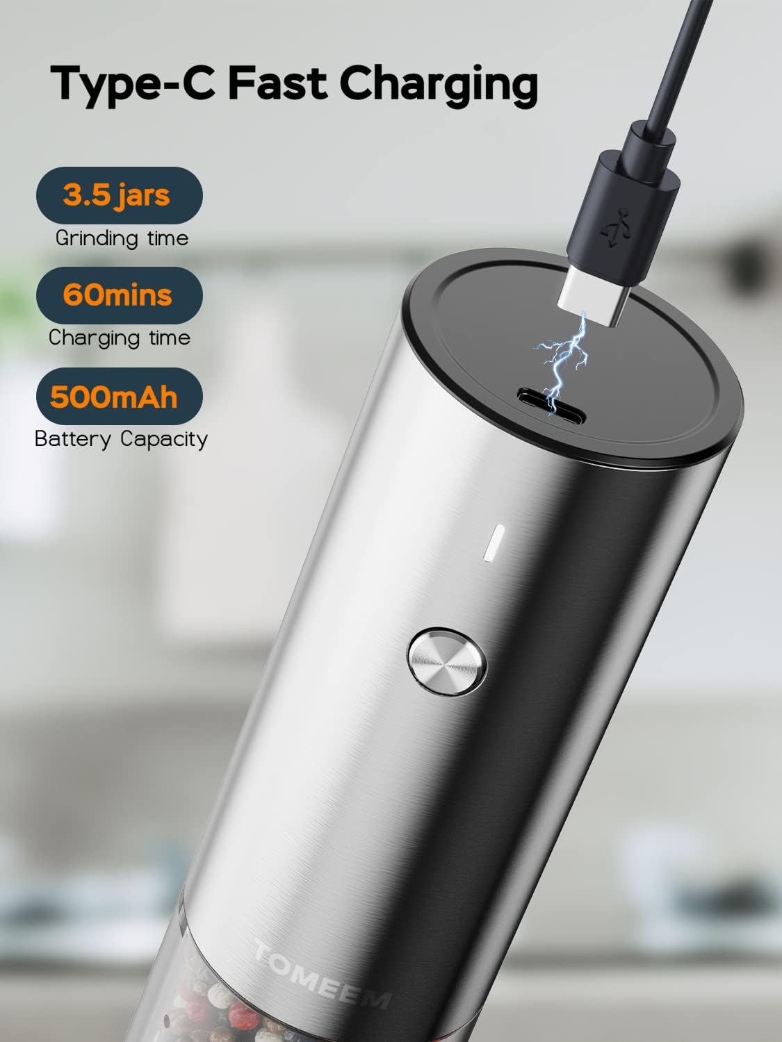 - [Type-C Fast Charging] No needs for preparing batteries any more! TOMEEM rechargeable salt and pepper grinder comes with a Type-C charging cable for quick charging, grinding at least 60g of spices after fully charged. Fitted with charging indicator, it’ll easily let you know when to go charging for the grinder.