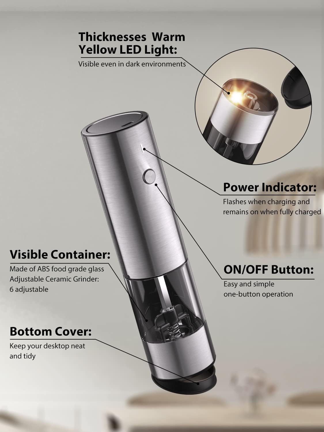 - [Convenient Charging] No need to prepare batteries anymore! TOMEEM rechargeable salt and pepper grinder comes with a Type-C charging cable for quick charging. The charging indicator lets you know when it's time to charge the grinders.