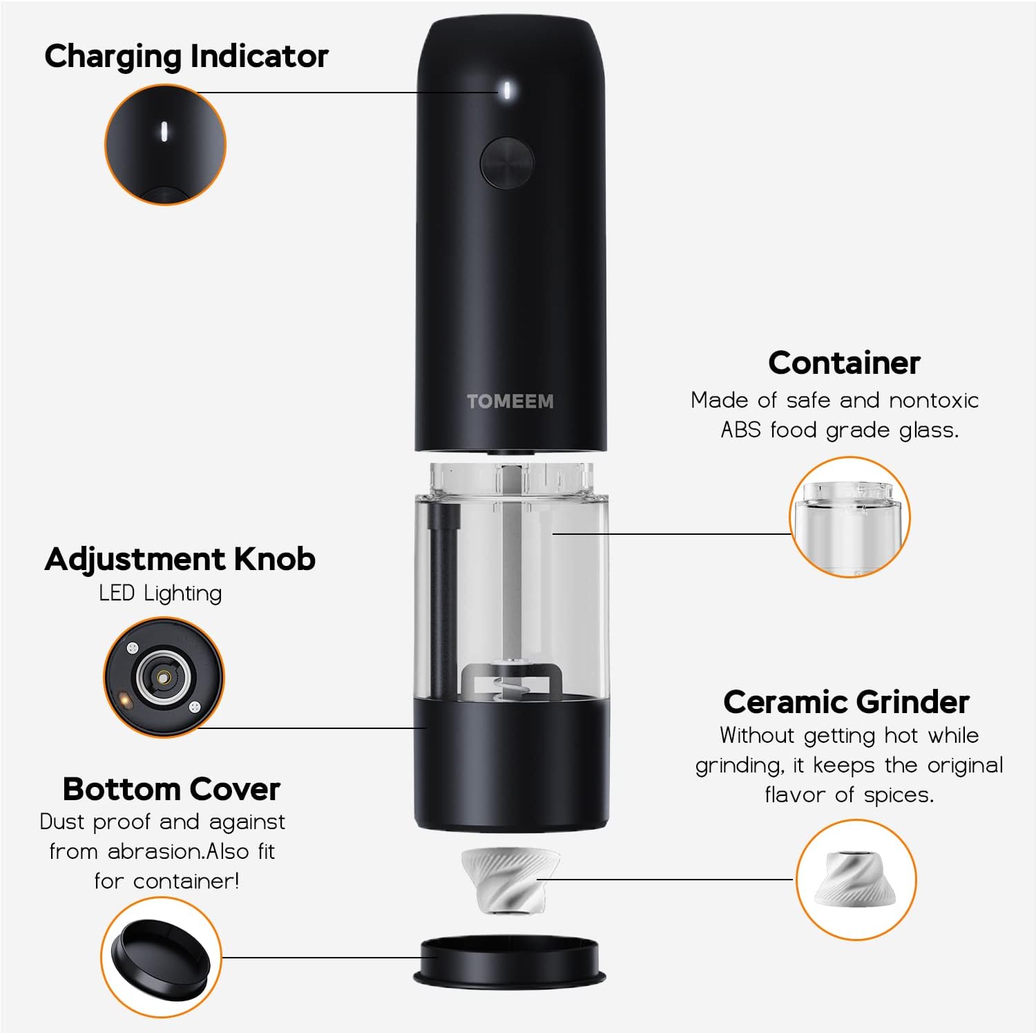 - [Cool Kitchen Gadget Gift] Grinding spices including black pepper, white pepper, salt, Himalayan salt, red pepper flakes, rosemary, anise seeds, flax seeds, and cumin seeds effortlessly, TOMEEM pepper grinder for spices and seeds are also perfect gifts for your chef and cook friends.