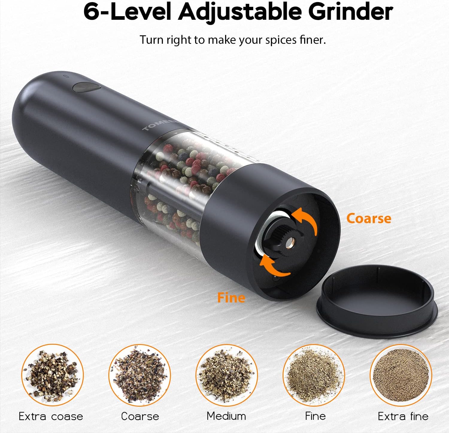 ![[Upgraded Larger Capacity] TOMEEM Long Electric Black Salt & Pepper Grinder with 6-Level Adjustable Coarseness, Easily One-Hand Operated Rechargeable Salt Grinder & Pepper Mill](http://ustomeem.com/cdn/shop/products/716Y92Ozm9L._AC_SL1500.jpg?v=1680060860&width=1445)