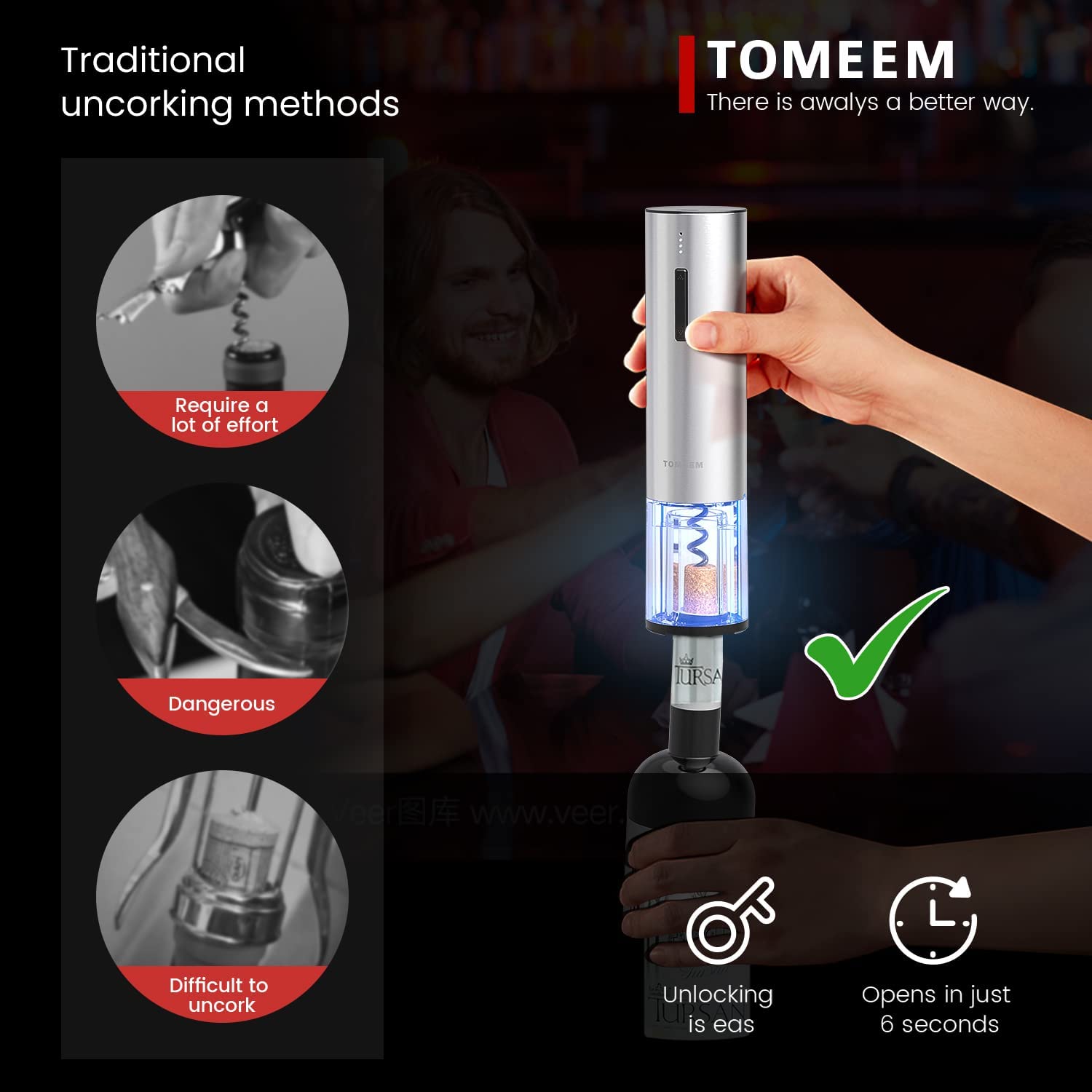 - Elegantly Open The Bottle - TOMEEM Electric wine bottle opener is equipped with a foil cutter, which can be easily removed by first placing it on a new wine bottle and turning it clockwise. The Electric wine opener is then placed vertically on the bottle, the "down" button is pressed and the cork is quickly pulled out in six seconds.