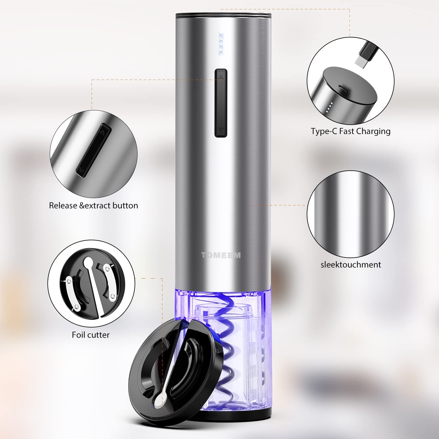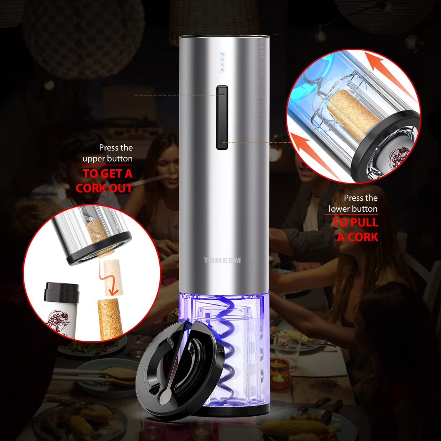 - Electric Wine Opener: Made of Classic Stainless Steel case, carbon steel spiral, Tomeem automatic wine opener can remove the cork effortless in seconds, Intimate indicator design lets you know the power of the bottle opener at any time, the electric corkscrew extractor can open up to 60 bottles with a full charge in one hour.